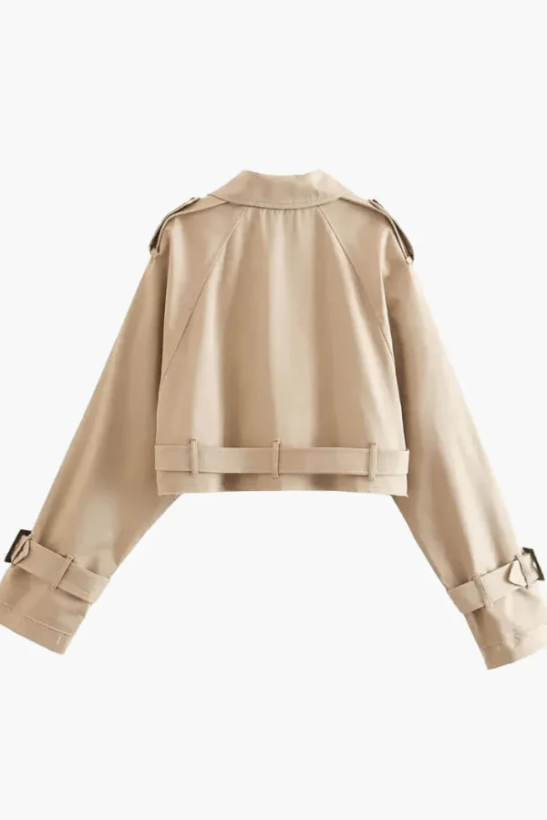 Introducing our Eve cropped Trenchcoat, crafted from gabardine for an effortless blend of style and function. This cropped Trenchcoat. features black buttons, a belt, and a double-row design, making it perfect for everyday wear, work, or university. With a vintage, chic autumn aesthetic, it seamlessly complements your look, whether you're heading to the office or attending classes. Elevate your collection with this essential piece.