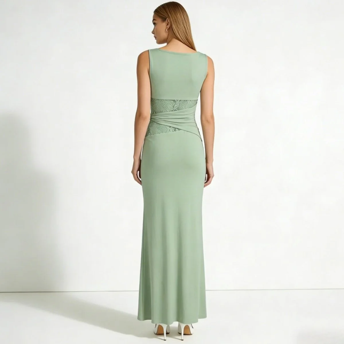 Your eye is drawn to the waist—an artful, asymmetrical wrap of fabric that parts to reveal panels of exquisitely delicate lace. It’s a whisper of intrigue, a hint of romance against a canvas of clean, contemporary design. This is sophisticated allure, designed to highlight your narrowest point and create an unforgettable, hourglass shape from every angle.